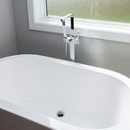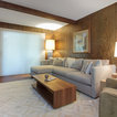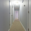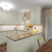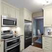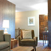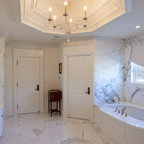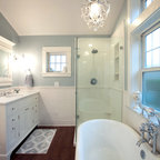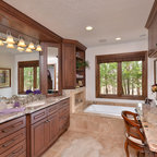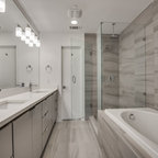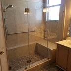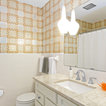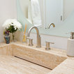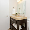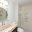 Affordable, beautiful and durable porcelain tiles cover the floors and shower walls, along with a shining accent of glass mosaic tiles. The amazing vanity features a thick travertine top with an integrated sink.