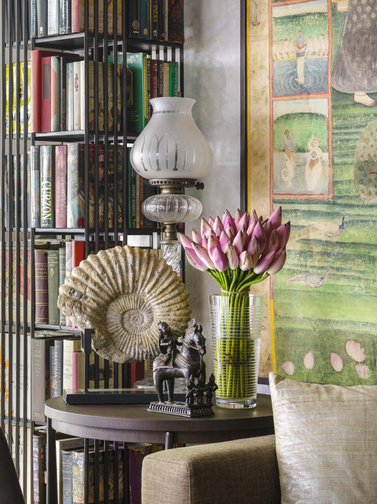 A leather-topped side table on mild steel legs has an eclectic arrangement of a 19th century antique Osler lamp, a large 200 million year old ammonite fossil from Morocco. An 18th century tribal bronze statue of Shiva on a horse, with a contemporary arrangement of lotuses in a glass vase that reflects the painted lotuses in the lower perdella of the pichhwai.