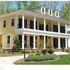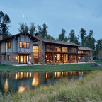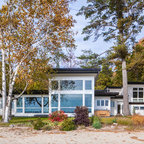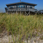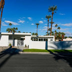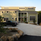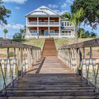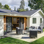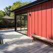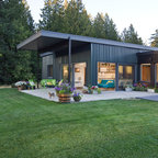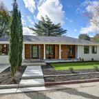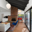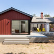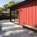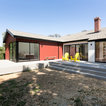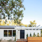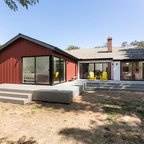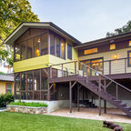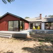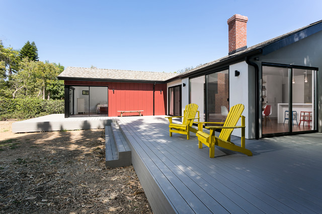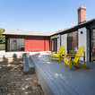Back yard with raised deck wrapping all elevations with sliding glass aluminum doors. Photo by Clark Dugger