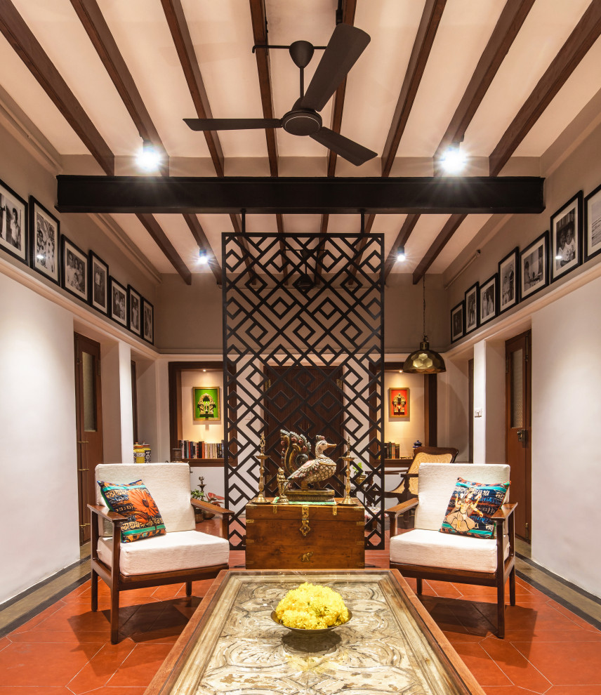 A tall lattice screen demarcates the public areas from the private areas of this home by Studio Context Architects.