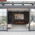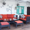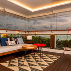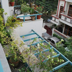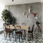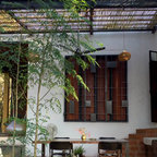 Rooftop loungeThis rooftop seating arrangement by INC Design Studio is a colourful spin on casual outdoor cafes. The hand-drawn wall mural breaks away from the blocks of red, turquoise and black. See how the lone window shutter bursts out in turquoise, forming an eye-popping focal point along the wall.