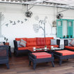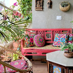 A faux rustic window sourced from an antique wood mart in ChorBazar was refurbished and incorporated with solid bird cages and hand-painted trees and birds to form a serene perspective. This nearly neutral mix forms a contrasting background to dark rattan cane furniture with block-coloured cushions in ‘Sunbrella Fabrics’ accompanying various hues.