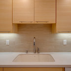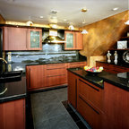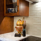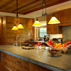 wood cabinets, tile concrete floors, green tile, lights