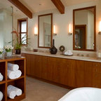 Large mirrors, both at the vanity and over the tub, effectively reflect all of these layered light sources for the best effect.