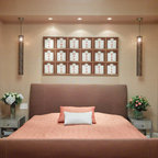 Over the foot of the bedAnother location that can be enhanced by hanging a pendant fixture is above the foot of a bed. How low to hang a fixture in this situation will be guided by the ceiling height as well as the size of the bed and fixture. The fixture must be hung high enough so that there is no risk of hitting your head when sitting on the bed, as well as when getting in and out of bed.