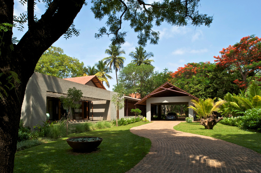 The home’s driveway winds lazily from the northeast corner of the woodland property to a freestanding gabled portico.