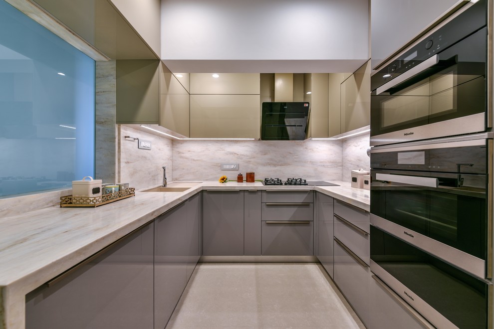The Kitchen was upgraded three folds with a better planned layout from the existing one turning it into a fully modern and equipped modular Kitchen from Blum with a much better planned servant quarter. Corian counters and wall dados and PU shutters lend a sleek and stark modern look.