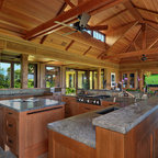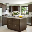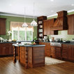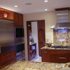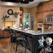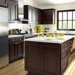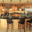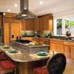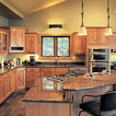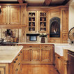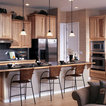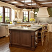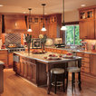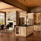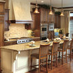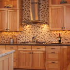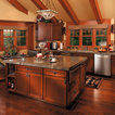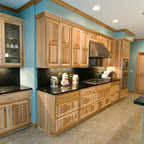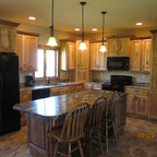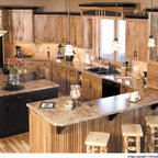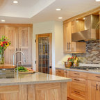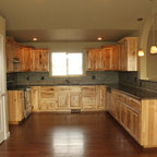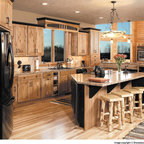 Cabinets of varying heights and depths, along with the dramatic grain variations of Hickory, keep this kitchen visually interesting! Matching brackets were used on the island as a decorative touch.
