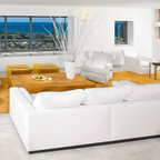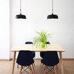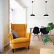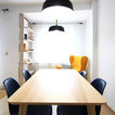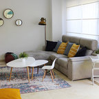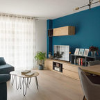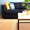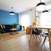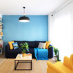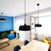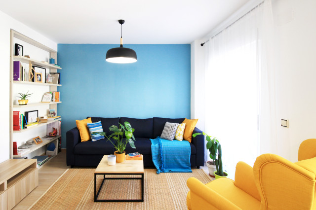 Salón joven y atrevido, en tonos azules y mostazas, combinando maderas claras, fresno y haya, con texturas naturales como el yute. Detalles en negro.