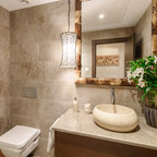 Charcoal and bronzeInfuse the wonder of marble into hexagonal floor tiles to reap traditional luxury in a modern avatar. Dark and smoky, this powder room is the epitome of simple elegance. The stone tile accent wall reflects the same marble finish as the charcoal hex floor tiles, and yet, the wall and the floor stand apart by virtue of the shapes of their tile .
