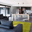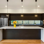 Modern kitchen with stone island bench, feature lighting and glass splash back