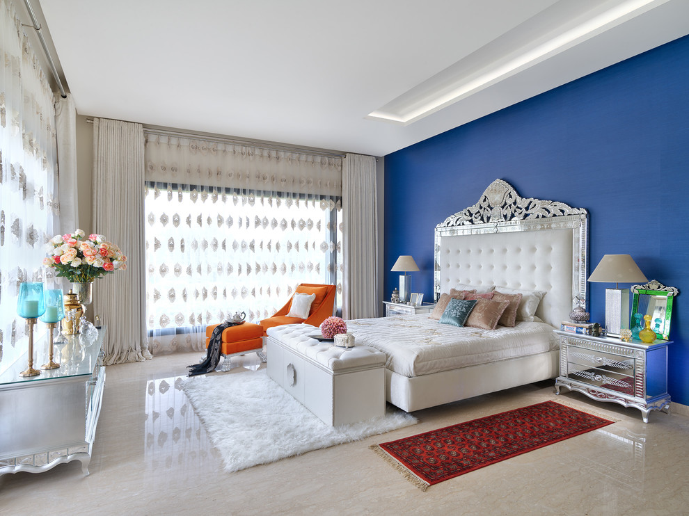 The master bedroom has a signature blue, ivory and silver theme, with an opulent Venetian bed enhanced with an...