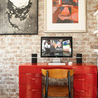Vincere converted this empty loft into a work/live space. Drawing from the richness of the old brick walls, this living room and dining/conference area came to life with warm color and texture creating a comfortable and inviting environment.