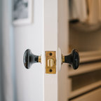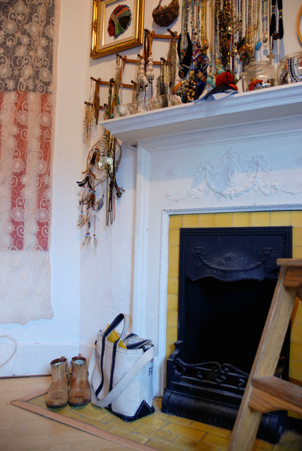 A second bedroom is now the couple's walk-in closet. Aside from working in merchandising, Tami runs an Etsy vintage shop called The Cloven Heart. Part of her jewelry collection hangs above the ornate original mantel. See a short video tour of this closet space on The Cloven Heart blog.