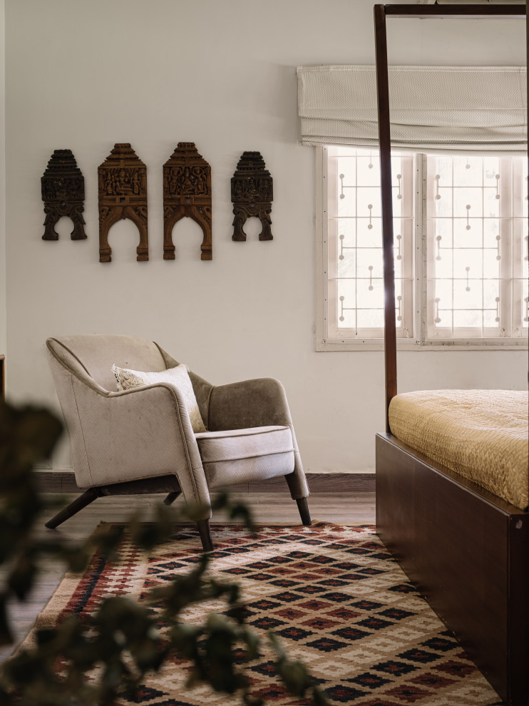 A row of intricately carved kavadis (structures used in the South Indian festival of Thaipusam) adorn the wall opposite...