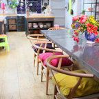 we like the mix of colors (maybe not THESE colors, but having a mix), and i like the playfulness of the resemblance to upside-down kitchen bowls or colanders.