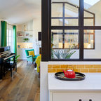 Three colourful custom-made colander lights add a splash of colour to this open-plan kitchen in a converted Victorian school house. The kitchen island is custom-made out of a vintage oak chest.