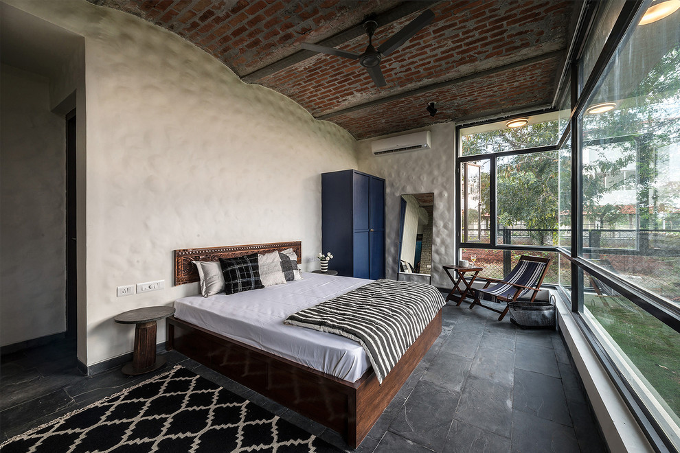 Inspired by industrial decor, the exposed bricks in this bedroom ceiling steal the show. The raw metal beams and...