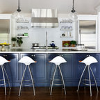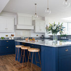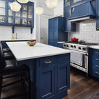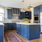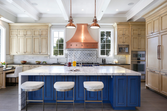 Copper range hood, blue cabinets (would tone down blue)