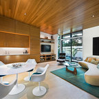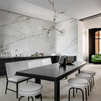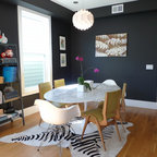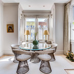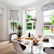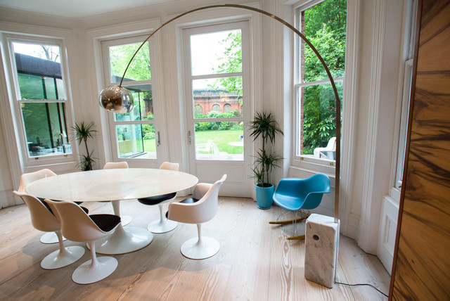 NW3 Interiors dining area with Saarinen Tulip dining table and chairs, Vitra Eames rocking chair and Flos Arco floor lamp