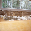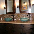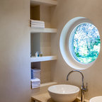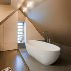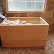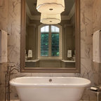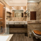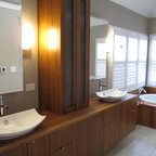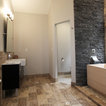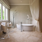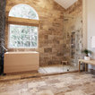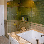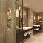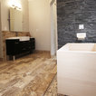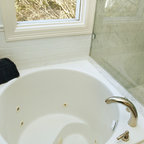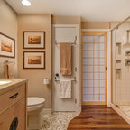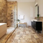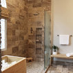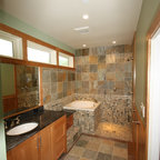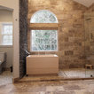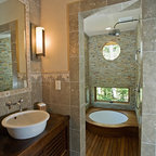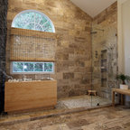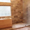 Japanese Hinoki Ofuro Tub in wet area combined with shower, hidden shower drain with pebble shower floor, travertine tile with brushed nickel fixtures. Atlanta Bathroom