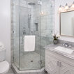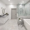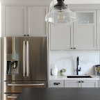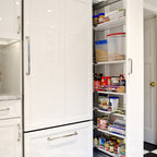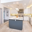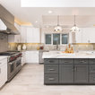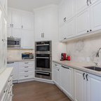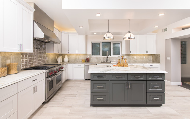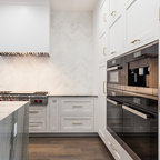 Kitchen with Carrara marble island countertop and gourmet appliances.