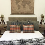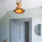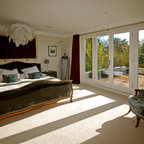 Large format marble tiles throughout the entire bathroom area create a luxe, spa-like feel and clearly mark the space as a different zone to the connected bedroom. A rustic table surface-mounted with twin basin is practical as well as stylish, bringing warmth and character to the space.Roll top bath painted in Palm Night by Dulux, shower mixer in black, basin mixer in black, distressed pine table console, Carlton low level WC suite, wall mounted towel warmer, all Aston Matthews. Serene Chalk Voile curtains on a ceiling mounted track, Hillarys. Arabescato tile and honed black marble splashback, Topps Tiles. Door and wall paint, Blackberry bush, Dulux.