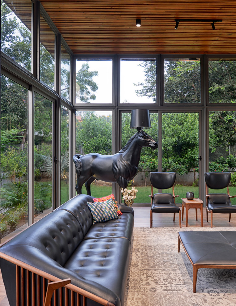 “The most interesting room for us is the formal living space,” Kesurvala says. The steel-framed glass window structure...