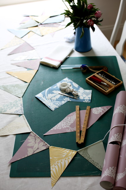 Wimpelkette aus Tapetenresten Kleine Tapetenreste eignen sich ideal zum Basteln, zum Beispiel für eine Wimpelkette. Einfach mehrere Trapeze zurechtschneiden, mittig umklappen und um ein Stück Faden kleben. Zum Geburtstag, Hochzeit oder für jede andere Party eine günstige und schnell gezauberte Deko-Idee!