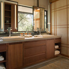 Guest bath idea - 01 (esta idea de open storage abajo es util para poner toallas para la visita y un pequeño storage con drawer bajo el sink) el mueble nuestro solo tiene 32” de ancho, pero creo que esta idea se puede adaptar bien.