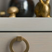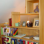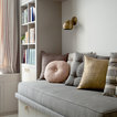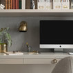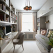 The cabinetry and millwork were created using a stained grey oak and finished with brushed brass pulls made by a local hardware shop. File drawers live under the daybed, and a mix of open and closed shelving satisfies all current and future storage needs.