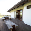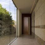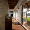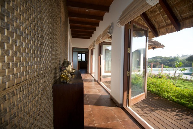 4. Enhance the inside–outside connection A corridor outside deserves as much attention as one inside. Here, the accent wall bordering the corridor is decorated with a sculpture and other accessories. It makes the most of the open space adjacent to it. The transparent glass doors let in natural light and provide alluring views of the outside, and also fold back to give untrammelled access.