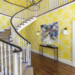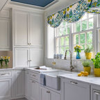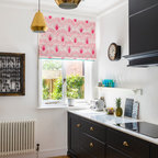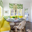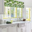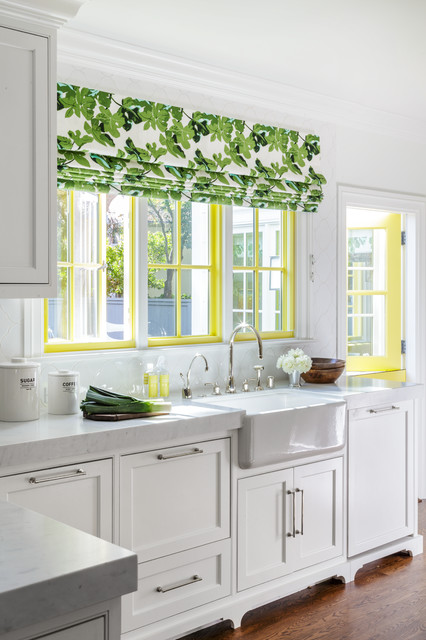 This green floral Roman shade livens up the neutral kitchen. Cheery yellow window casings and a matching Dutch door also help.When using window treatments to pep up a neutral kitchen, I recommend taking one of two approaches. One option is to coordinate your decorative shade with accessories in similar colours. The other is to limit the colour and pattern in your kitchen to just the shade, window and doors, as shown here.