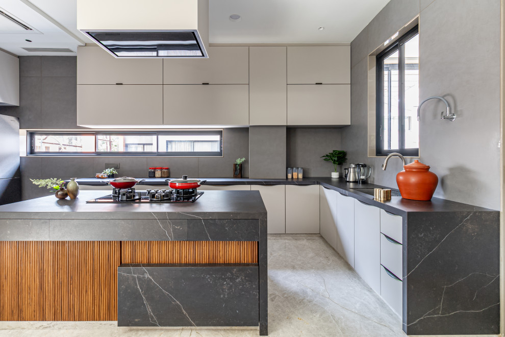 The east-facing kitchen, a Vastu-aligned placement for prosperity, continues the subtle grey theme with sleek cabinetry and stone flooring. Flowing seamlessly from the kitchen, the dining area features a Victorian-inspired stone-top table, a wooden bench-style seating, and bespoke chairs with intricate patterns. Enhancing functionality, a unique lift shaft acts as a passive cooling system, reinforcing sustainable design.