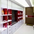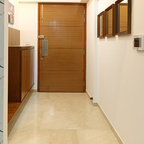4. Flush-mounted fixturesFor low-hanging entryways, flush-mounted fixtures can serve as streamlined lighting sources that offer ample light without occupying too much space. This contemporary Bengaluru entryway displays a restrained clean-lined aesthetic that is limited by space. Accessorised with circular flush-mounted fixtures, the entryway gets a break from the all-orange palette, as well as adequate lighting.Tip: A 23- to 40-watt LED bulb or several bulbs that make up the same wattage are an ideal choice for flush-mounted fixtures.