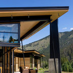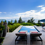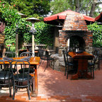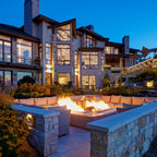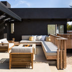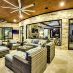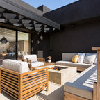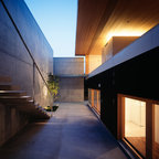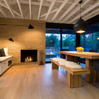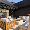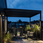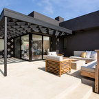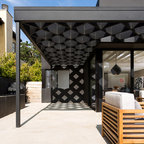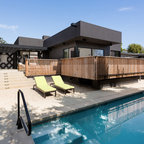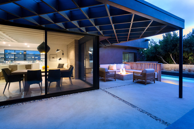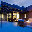 Under the pergola at dusk with the Dining Room and Kitchen beyond. Swimming pool at the far rear yard (right). Photo by Clark Dugger