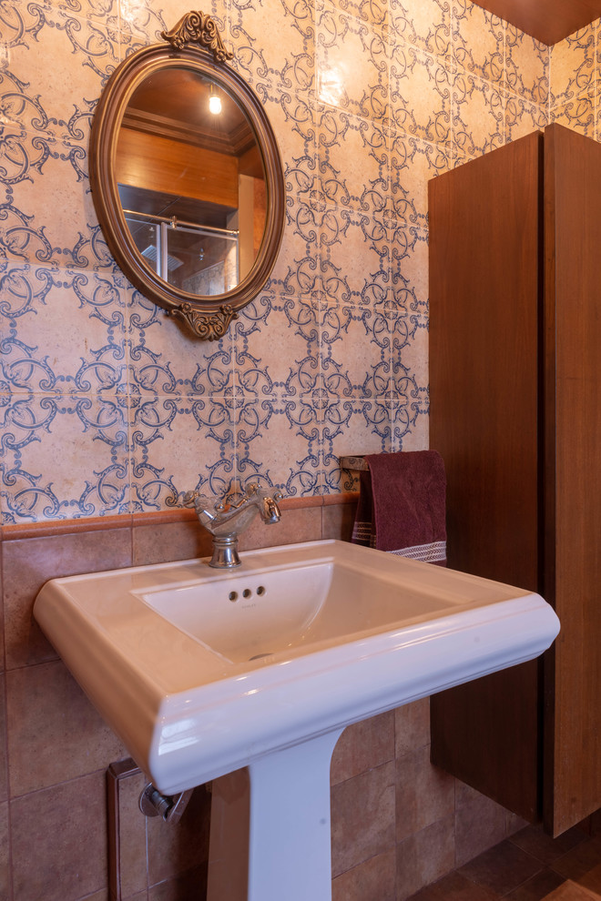 A Classical bathroom complementing the Home Office Library, The Mirror is an old piece bought from chor bazaar and restored