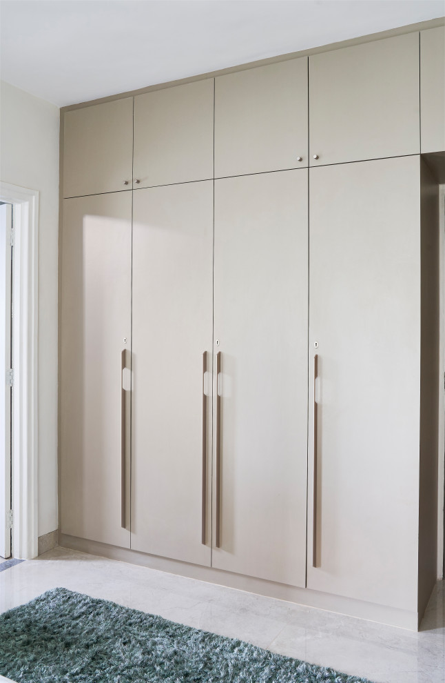 The wardrobe opposite the bed features a taupe laminate and sleek metal handles.