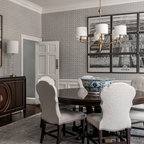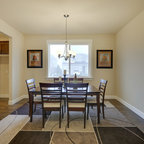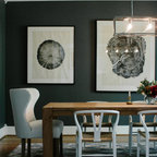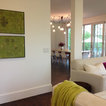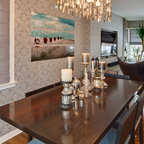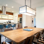Simple, modern dining area opens into the kitchen and living room. The minimal the color palette lends visual consistency to the large, flowing spaces.