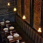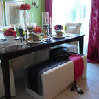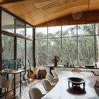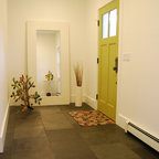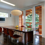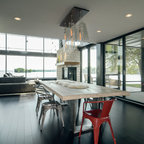 The sliding door leads to an adjacent stone patio and fire pit area. Material and furnishings include black 18x18 slate tile floor, walnut table, shell chairs and Edison light fixture from Pottery Barn.