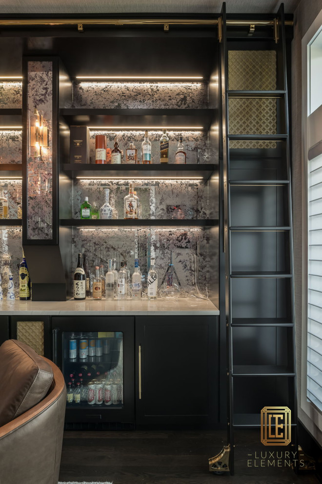 This modern home bar combines sophistication and functionality with custom black cabinetry, antique mirrored backsplash, and integrated LED lighting. Floating glass shelves and brass accents showcase an impressive liquor collection, while a built-in ladder adds both charm and practicality. Designed and built by Luxury Elements in Chicago, this one-of-a-kind bar transforms a living space into an elegant lounge perfect for entertaining.