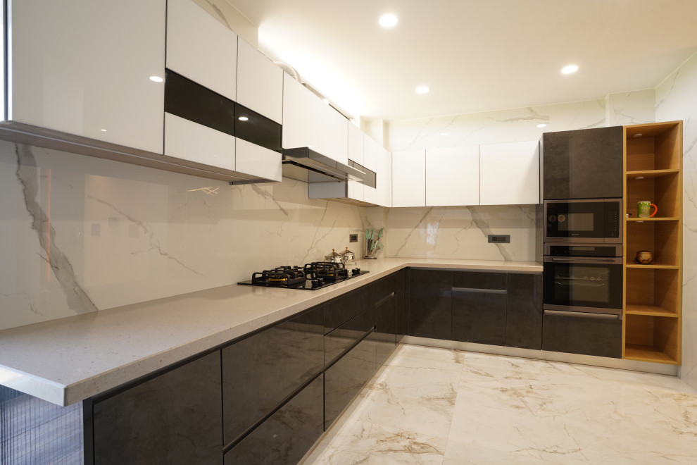 The modular kitchen is designed in UV finish with all the necessary units in place. It is a gorgeous combination of gray and white.