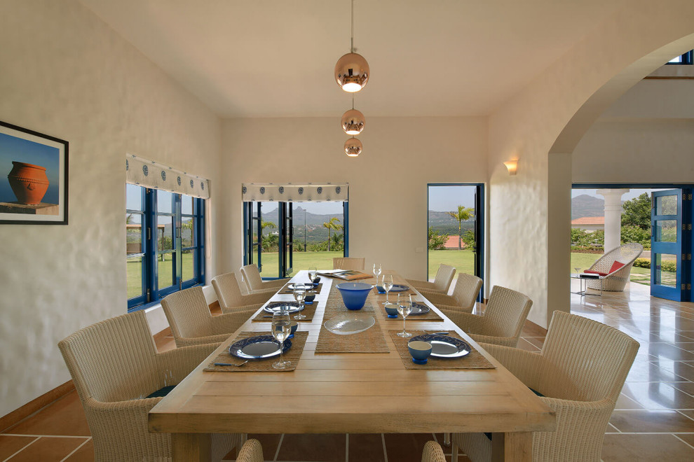 The living area leads to the dining room. According to Kumar, “This space exudes a sense of openness accentuated by its...