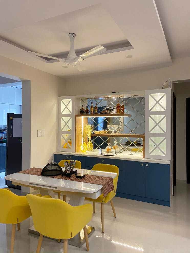 An eclectic crockery cum bar unit is styled in an eccentric blue colour with diamond shaped mirror back panelling and crystal knob handles. The diamond shape of the mirrors is reimagined in the shutter details as well. The unit is adequately lit with a combination of spot and cove lights, spot lights for fancy get together parties and cove lights that provide subtle illumination for those cosy date nights.
