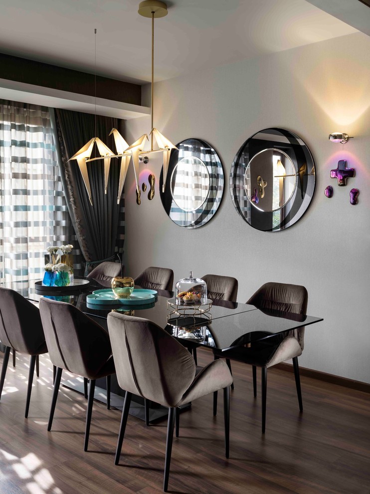 The dining room, which features the same rich base colour with splashes of turquoise, centres around an avian theme....