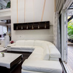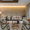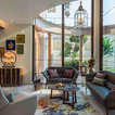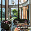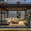 The glassed-in outdoor seating area in the garden has a snug, comfortable vibe thanks to the sectional and the high back chairs. “The light grey slowly recedes against the surge of beige in the flooring. Here a gold and beige furniture set is placed below the rich brown pergola,” says Tosar.