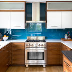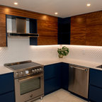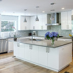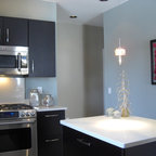 “Fun, and sustainable with good energy flow” were the requirements set by our client at our first meeting. As a Feng Shui consultant, our client requested that her new kitchen encourage good “Chi”. Since the original kitchen was shut off from the entire home, and was dark all year long, we decided that opening the kitchen to the public space was the first order of business. This incorporated more natural day lighting, to minimize the amount of artificial light being used during the day. The door to the dining room was relocated and part of the adjoining wall was removed. Due to financial restrictions (to keep the kitchen below $75,000), we decided to retain a post at the intersection of the removed walls. Eventually, a custom buffet cabinet will be installed in the opening.