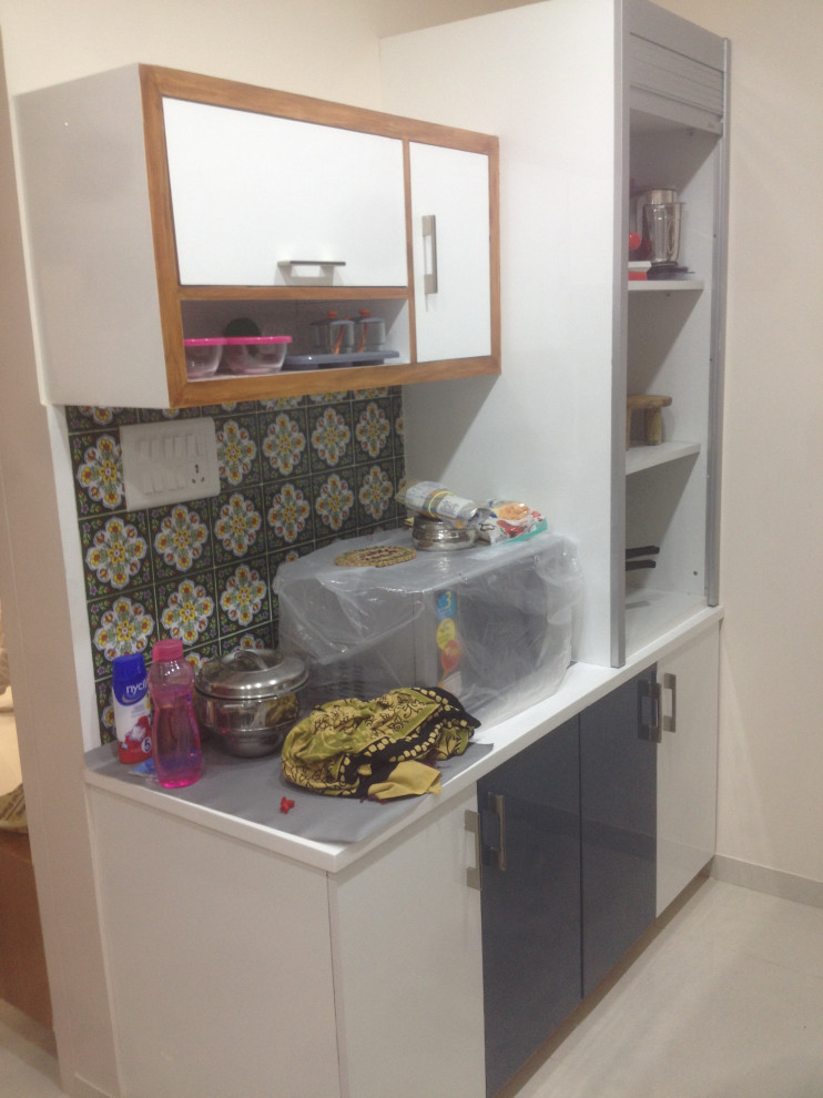 Very modern modular kitchen with a Korean platform top finished in PVC laminate. The backsplash for the serving platform is finished in hand made tiles to bring some colour in the kitchen.