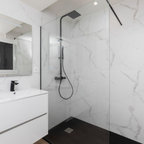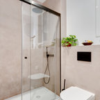Azulejos, algo más oscuros para pie de ducha, distribución con sanitario perfecto