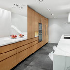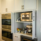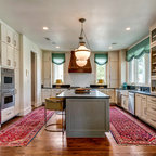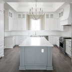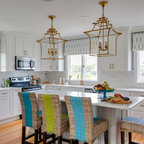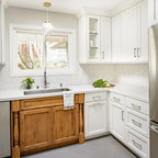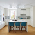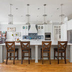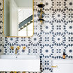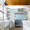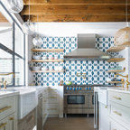 1. Feature a patterned tileAdding a patterned tile to your neutral kitchen can give it colour and personality. This blue-and-white tile pops against soft grey cabinets, white countertops and dramatic wood ceiling beams. Gold fixtures and cabinet pulls further liven up the space.Find a kitchen designer on Houzz to help you pick out a patterned tile